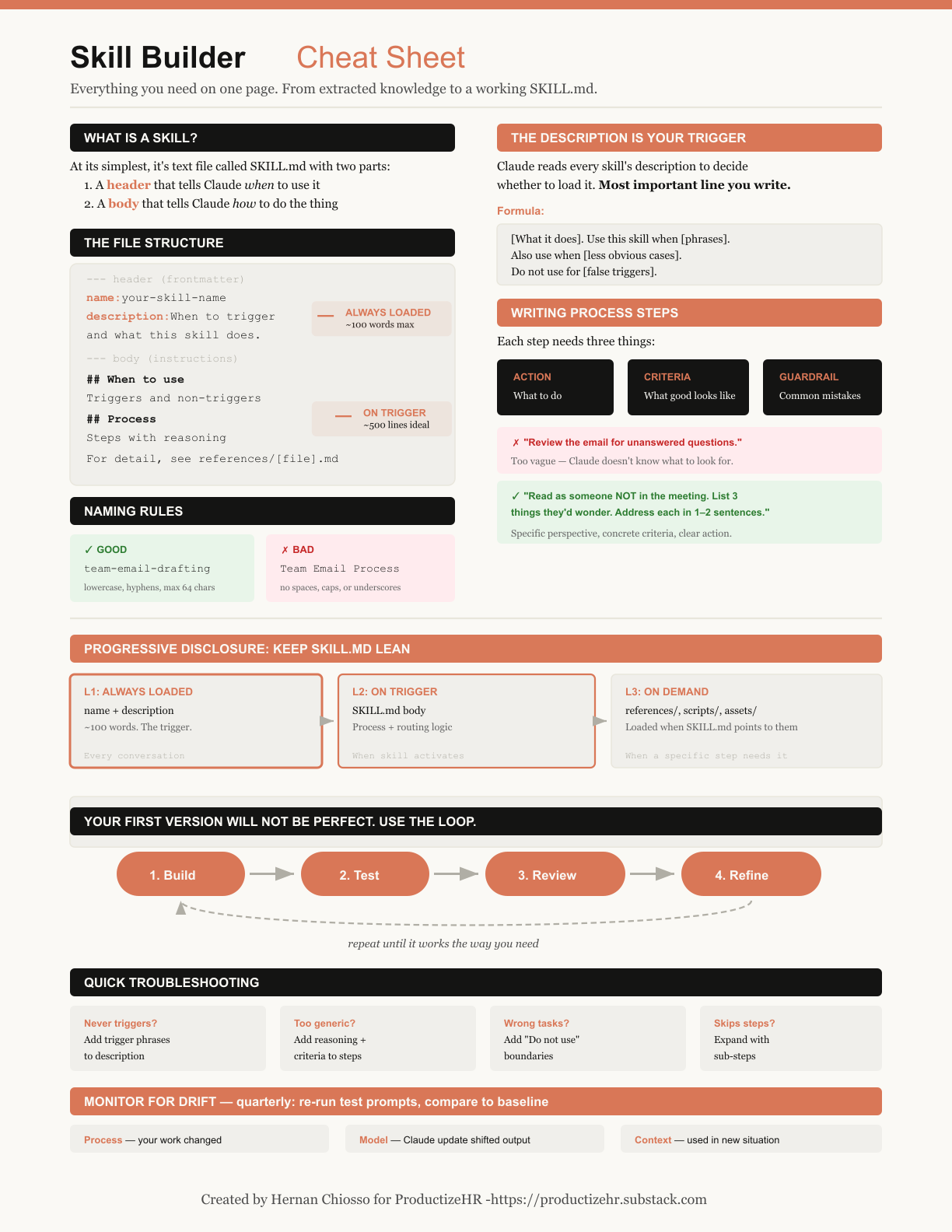 The Skill Builder Cheat Sheet — One page. The complete reference for what goes into a SKILL.md file: structure, naming rules, trigger logic, the recipe metaphor for progressive disclosure, the build-test-refine loop, and a troubleshooting guide for the four most common failure modes.
